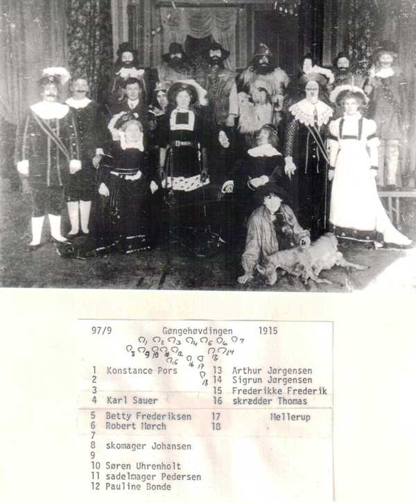 På scenen var bl.a. Arthur Jørgensen, Robert Mørch, Laurits Knudsen, Frederikke Frederiksen, Søren Uhrenholt, Skrædder Thomas, Astrid Sund, Konstance Pors, Anna Uhrenholt, kommis Houmøller, Herdis Sørensen, Elin Jensen, Karl Sauer, sadelmager Pedersen, Karl Kjeldsen, Betty Frederiksen, skomager Johansen, Pauline Bonde, Sigrun Jørgensen, Mellerup, Karen Skøth, Emilie Andersen, Stinne Mikkelsen, Kristine Frandsen, Rigmor Laustsen, Inger Katrine Jensen, Dorthea Svendsen, Magda Svendsen, Dagny Mikkelsen, Senia Andersen, Andrea Laustsen, Marie Mikkelsen, Ingrid Jensen, Doris Christensen, Anna Bach.